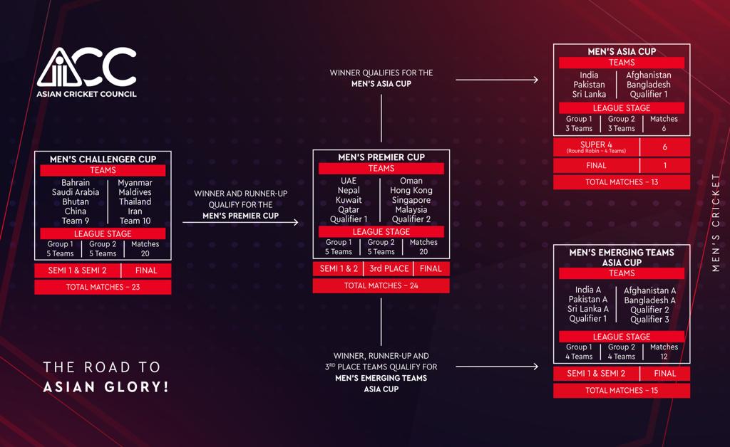 जवाफ हो पाउनेछ। महिला एसिया कप पनि एउटै ढाँचामा (च्यालेन्जर कप, प्रिमियर कप र त्यसपछि एसिया कप) तर फरक योजनामा हुनेछ। एसिया कपमा भारत, पाकिस्तान, श्रीलंका र बंगलादेश स्वतः छनोट हुने गरी ६ टोलीले प्रतिस्पर्धा गर्नेछन् । पहिलो, एसियाली महिला एसोसिएट टोली ९ देखि १८ सम्मको वरीयतामा रहेको च्यालेन्जर कपमा भिड्नेछ, जहाँबाट दुई टोली अर्को प्रतियोगितामा पुग्नेछन्।