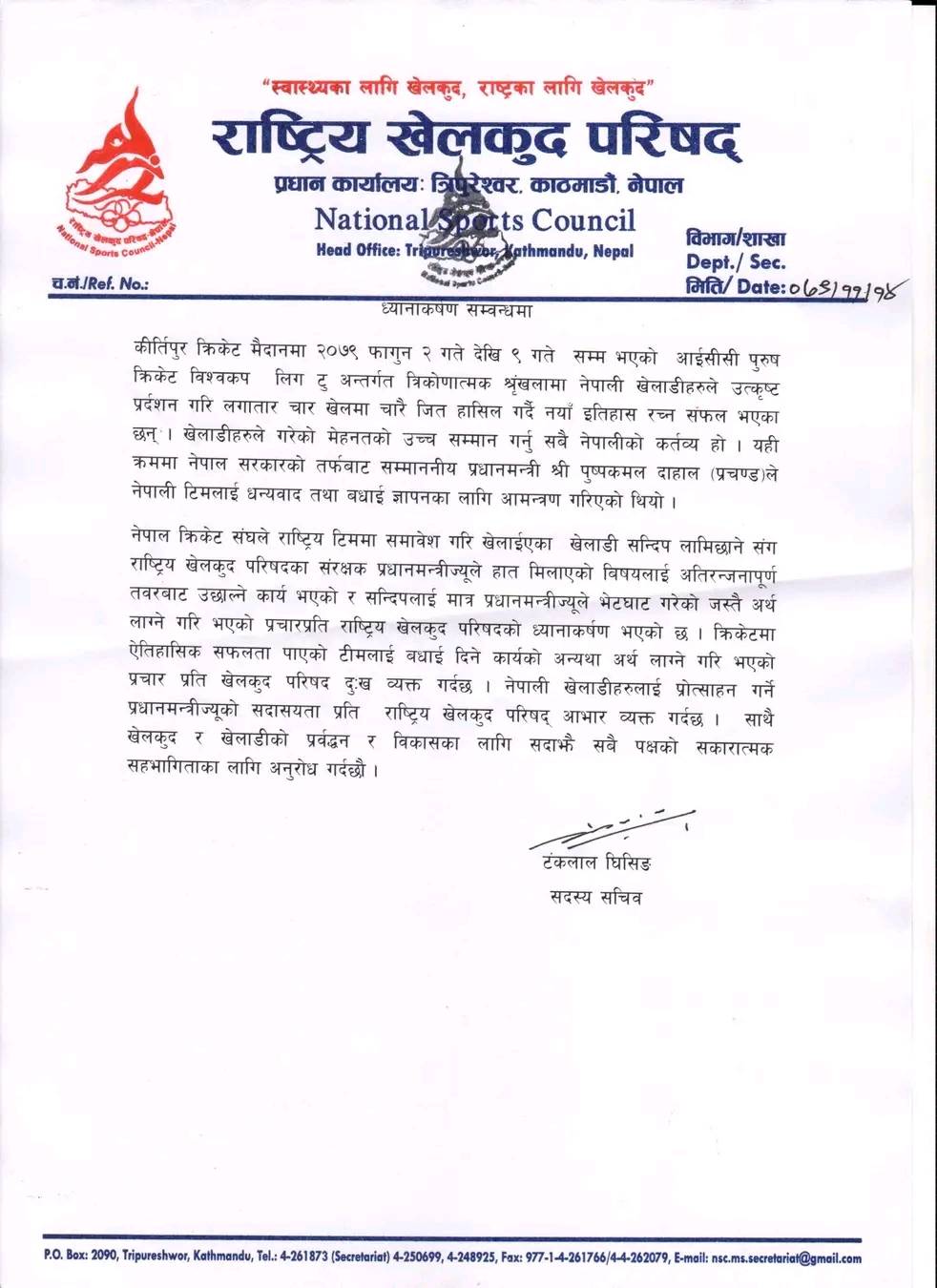 आज राष्ट्रिय खेलकुद परिषद्ले अहिले चलिरहेको विवाद बारेमा ध्यानकर्षन निकालेको छ । राष्ट्रिय खेलकुद परिषद् (राखेप) ले नेपाली क्रिकेटर सन्दीप लामीछानेसँग प्रधानमन्त्री पुष्पकमल दाहाल (प्रचण्ड) ले हात मिलाएको सम्बन्धमा अतिरन्जनापूर्ण प्रचार-प्रसार गरिएको भन्दै ध्यानाकर्षण गराएको छ । फागुन २ गते देखि ९ गते सम्म भएको आईसीसी पुरुष क्रिकेट विश्वकप लिग टु अन्तर्गत त्रिकोणात्मक श्रृंखलामा नेपाली खेलाडीहरुले उत्कृष्ट प्रर्दशन गरि लगातार चार खेलमा चारै जित हासिल गर्दै नयाँ इतिहास रच्न सफल भएको उल्लेख गरिएको छ ।